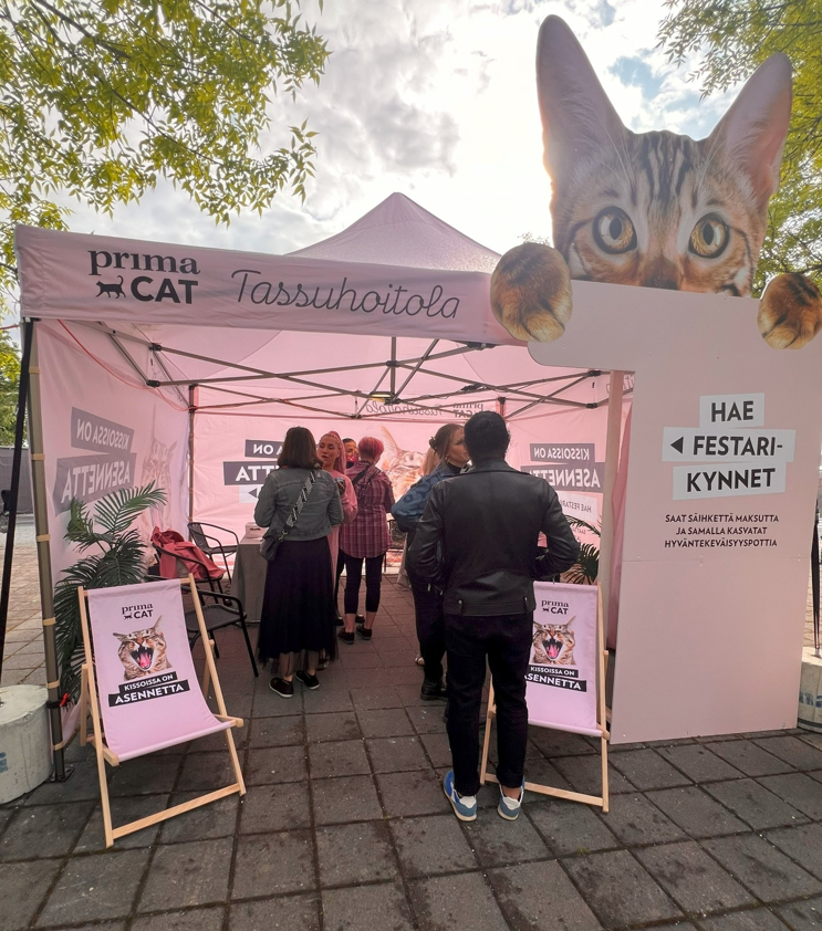 Kissoissa on asennetta- Tassuhoitola Rockfestillä PrimaCat erottui tummanpuhuvasta ympäristöstä vaaleanpunaisella promopisteellään. Tassuhoitola tarjosi kävijöille ilmaista glitteriä, kynsiä ja tatuointeja – mahdollisuuden näyttää oma asenteensa. Kontrasti mustiin pukeutuneiden rokkareiden glitterpartojen kanssa oli puhutteleva ja viraali. Näkyvyys ulottui myös Rockfestin screeneille ja kanaviin, sekä Radio Rockin lähetyksiin nostaen PrimaCatin keskiöön. Monroe nosti Tassuhoitolaa ja SEY-yhteistyötä omassa somessaan ennen festareita. Tammerfestin toteutus- Kissoissa on asennetta- Tassuhoitola Konsepti jatkui Tammerfesteillä. Tapahtuma-aikana haltuun otettiin Tampereen kauppakeskusten diginäytöt, tavoittaen festarikansan eväsostoksilla. SuomiPopin radiopromo nosti kissojen asennetta ja liput kytkettiin osallistumiseen. Tapahtumassa artisti BESS julkaisi somepostauksia Tassuhoitolasta, aktivoi seuraajiaan ja linkitti kampanjaan uuden kohderyhmän. Jokainen jaettu asennelook lisäsi PrimaCatin lahjoituksia SEY:lle. Toteutuksesta vastasi molemmilla festareilla Fuse ja Vaihde Helsinki Oy.